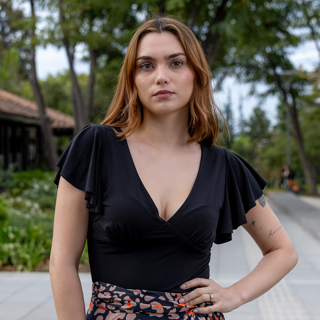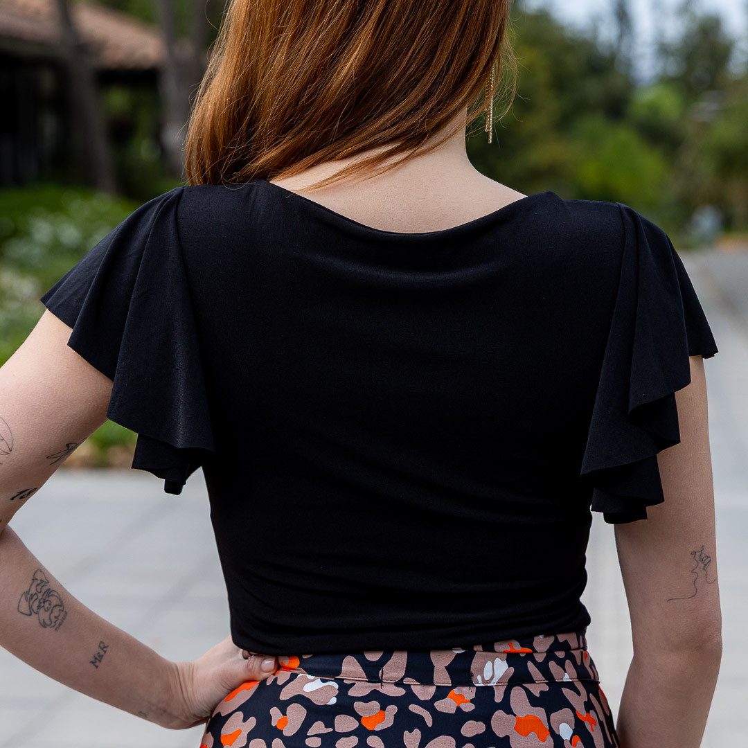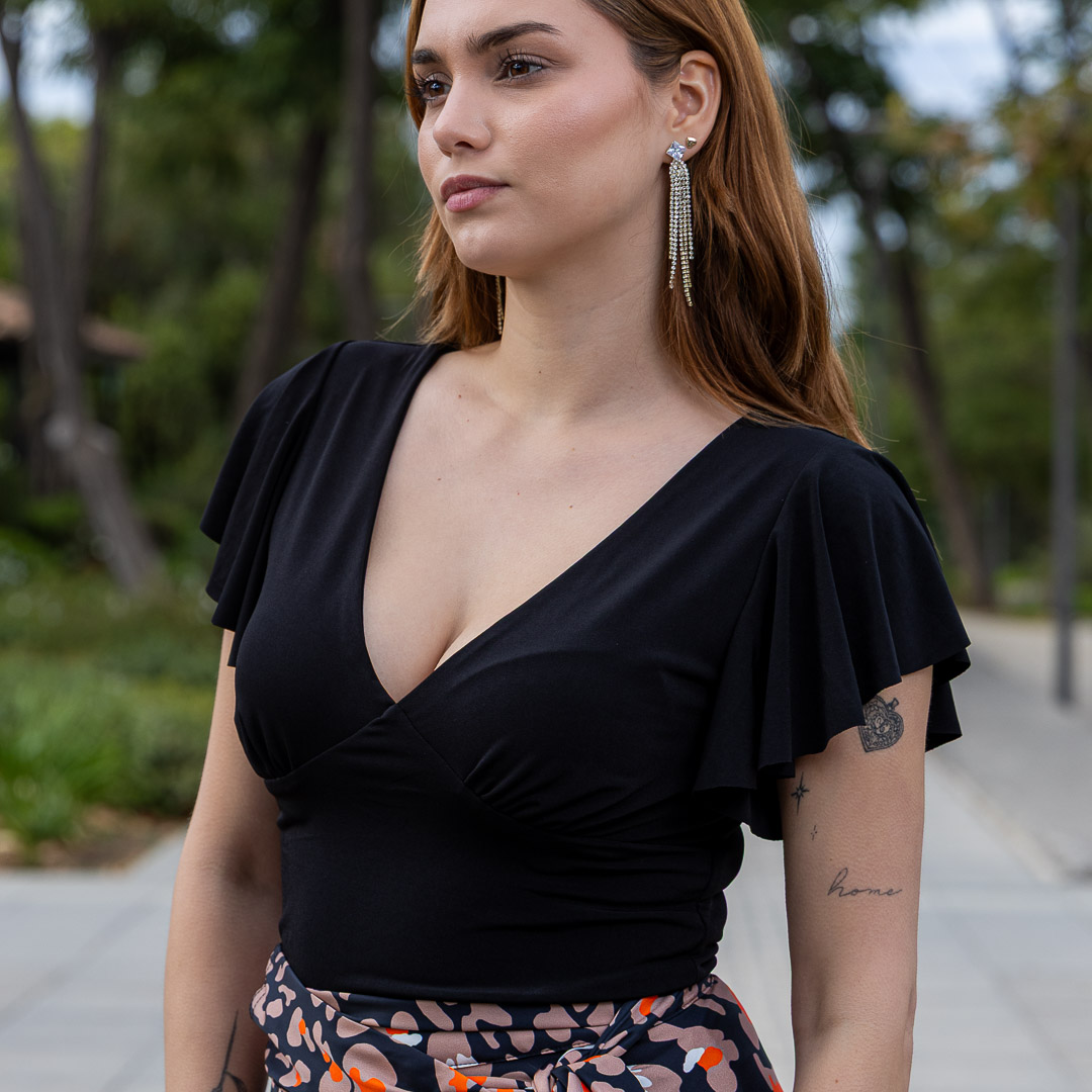 El top con un escote en “V” pronunciado que estiliza la figura y aporta un toque elegante y sensual sin ser excesivo.