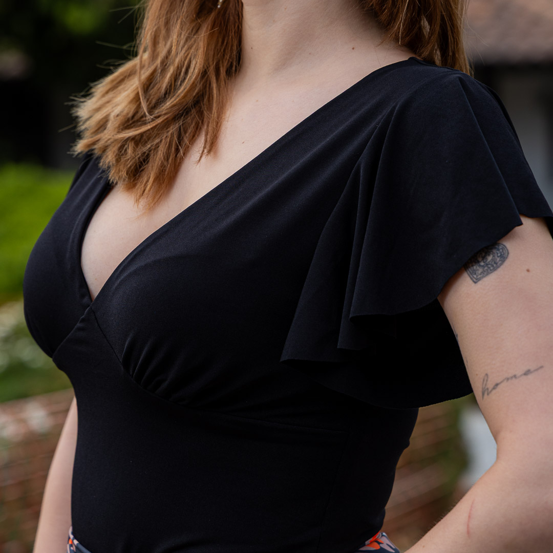 En la parte frontal destaca un diseño fruncido y cruzado que crea un efecto drapeado muy favorecedor, ayudando a marcar la cintura y dar forma al torso. Las mangas son cortas con vuelo tipo “volantito”, lo que añade movimiento y un aire romántico al diseño.